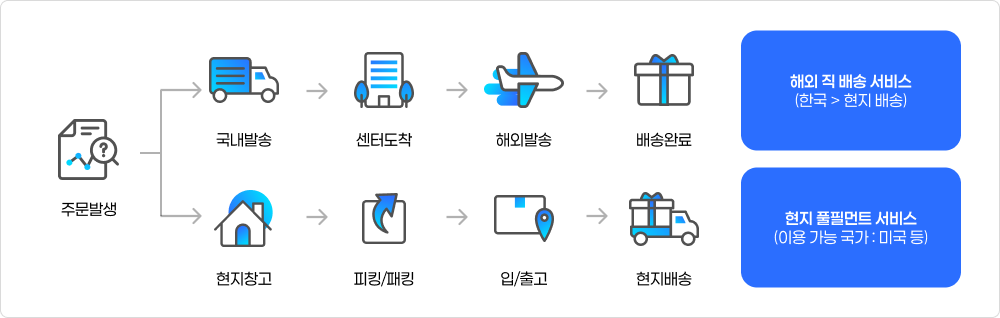 해상, 항공 운송, 통관 등 국내 픽업부터 현지 배송까지 해외 직배송 서비스를 제공하고 있으며 배송 뿐 아니라 현지 풀필먼트 이용에 대한 적합 여부, 계약 과정을 함께합니다.